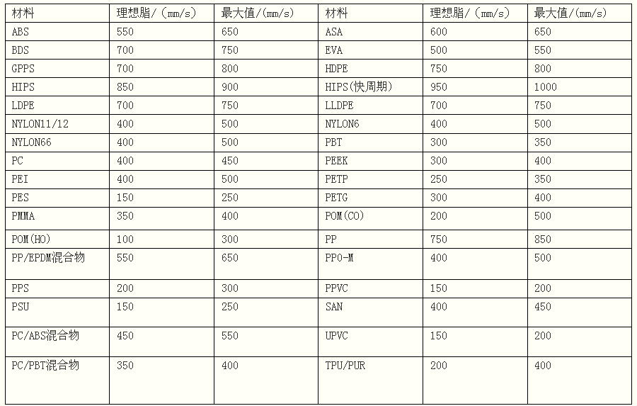 如何讓進(jìn)行螺桿速度設(shè)定??應(yīng)該是大家所關(guān)心的問(wèn)題吧!現(xiàn)在我就來(lái)編輯一些專業(yè)化的數(shù)值表格,希望大家看完會(huì)對(duì)大家有所幫助!螺桿的表面速度(mm/s)=螺桿直徑(mm)x螺桿轉(zhuǎn)速x0.0524.現(xiàn)在我來(lái)說(shuō)說(shuō)典型的螺桿速度吧!如下圖: